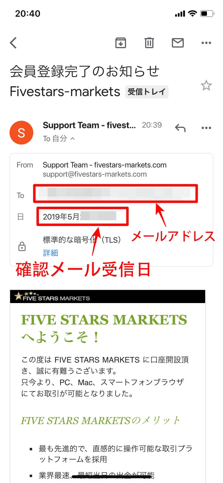 ③口座開設完了後、FIVE STARS MARKETSにログインできることを確認する(登録したメールアドレス宛に、ファイブスターズマーケッツから送信されたメールの内容をスクリーンショットで撮影する)