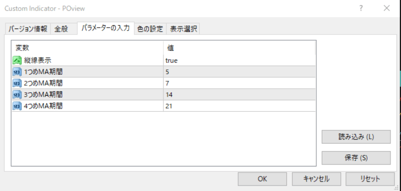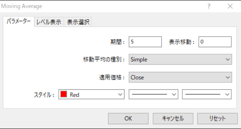 それから、移動平均線の期間や線の色などに関する設定を細かく説明すると・・・