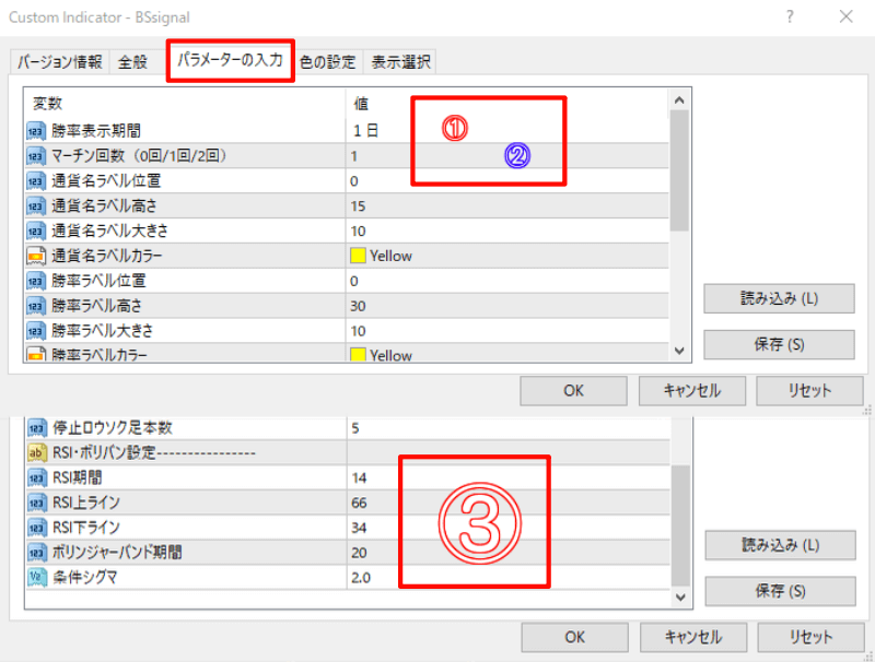 上記の画像は、インジケーター「BS signal」のパラメーター設定の項目になるわけですが、覚えて頂きたいところは、①〜③のところになります。